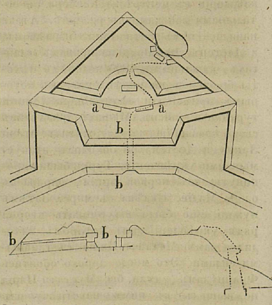 В сочинениях Кормонтаня, Сен-Поля и других французских инженеров находим правила, удовлетворяющия вполне первым трем условиям; относительно же последняго, нельзя не отдать полной справедливости следующему предположению Астера: отряд, оборонявший брешь, будучи принужден к ретираде, отступает по апарелям (аа) в ров Абшнита, а оттуда по потерне (bb) в самую крепость, не смешиваясь с отрядом, обороняющим Абшнит.